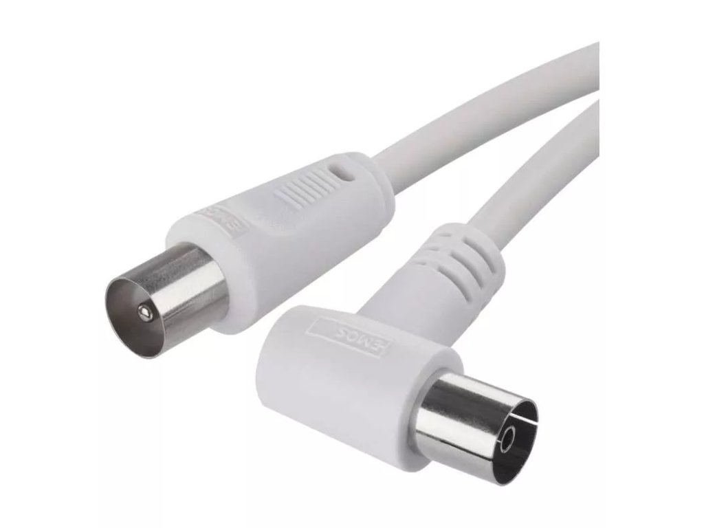Anténní koaxiální kabel s vidlicí a zásuvkou IEC. Kabel má úhlový konektor (90°). Kabel má dvojité stínění pro redukci elektromagnetického rušení. Délka kabelu je 5 m. Koaxiální kabel je vhodný pro SAT, DVB-T, ANT, DECODER, FLAT TV a TV.