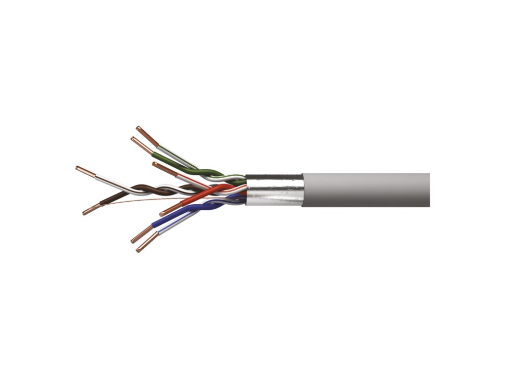 Stíněný horizontální kabel nejvyšší kvality kategorie CAT5E s PVC pláštěm. Jádra vodičů vyrobeny z nerecyklované mědi. Kabel splňuje požadavky směrnice CPR o stavebních výrobcích.