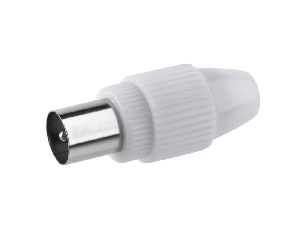 IEC konektor vidlice je určen k napojení na koaxiální kabel a má bílou barvu.