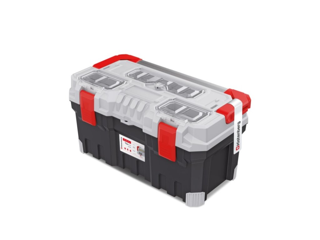 Multifunkční box na nářadí TITAN Plus s odolnou hliníkovou rukojetí. Kvalitní spony z ABS. Průhledné organizéry s polykarbonátovým víkem. Rohy korpusu z elastomeru. Uvnitř vyjímatelný koš.