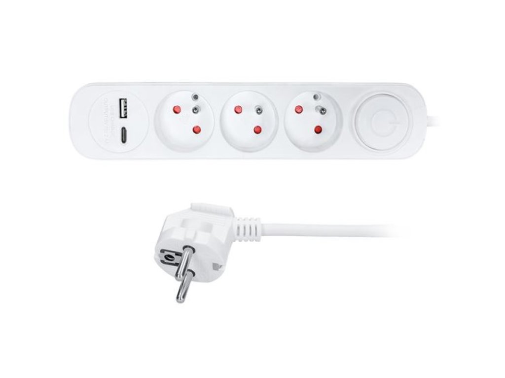 Počet zásuvek: 3x 2P+PE + USB A + USB C