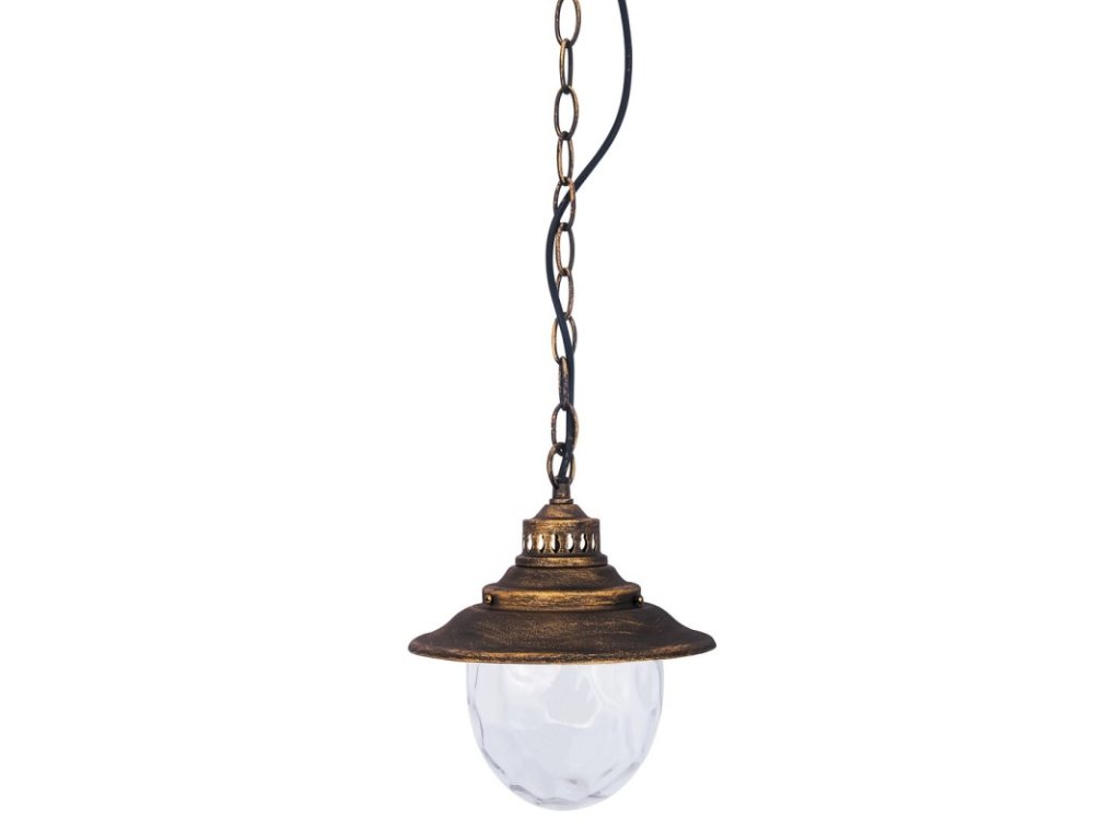 Venkovní svítidlo s 1 paticí. Starožitné kovové svítidlo zlaté barvy má skleněné stínítko a krytí IP43. Svítidlo lze použít se zdrojem světla až 60W, s paticí E27.