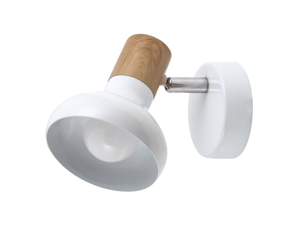 Bodové svítidlo severského stylu s 1 paticé. Kovové svítidlo v bílé a bukové barvě s polohovatelným stínidlem a krytím IP20. Svítidlo lze použít i s úspornou žárovkou o výkonu až 40W, patice typu E14.