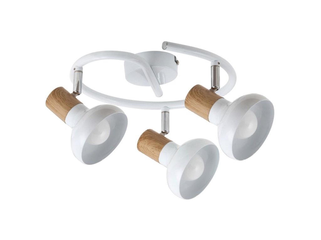 Stropní bodové svítidlo v severském stylu se 3 paticemi. Kovové svítidlo v bílé a bukové barvě s polohovatelnými stínidly a krytím IP20. Svítidlo lze použít se 3 úspornými žárovkami o výkonu až 40W každá, patice typu E14.