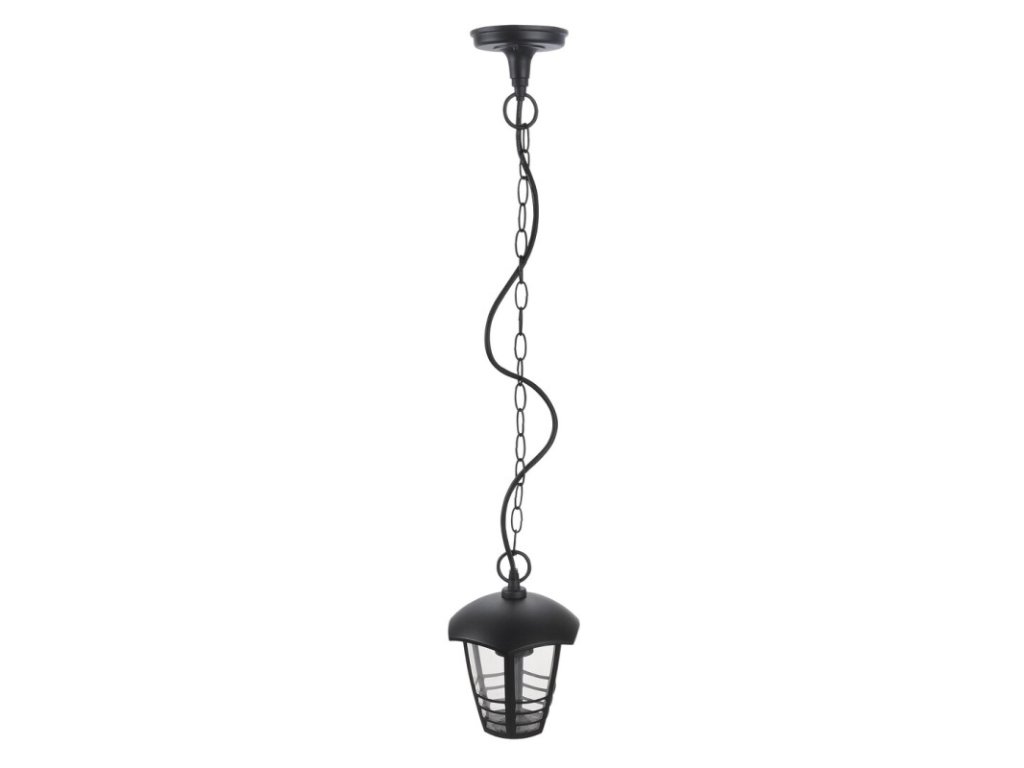 Venkovní závěsné svítidlo s klasickým vzhledem, 1 objímkou a designem odolným proti UV záření. Černé kovové svítidlo s vodotěsným stínidlem a ochranou IP44 proti stříkající vodě a prachu. Svítidlo lze použít se světelným zdrojem s výkonem až 60W, patice typu E27.