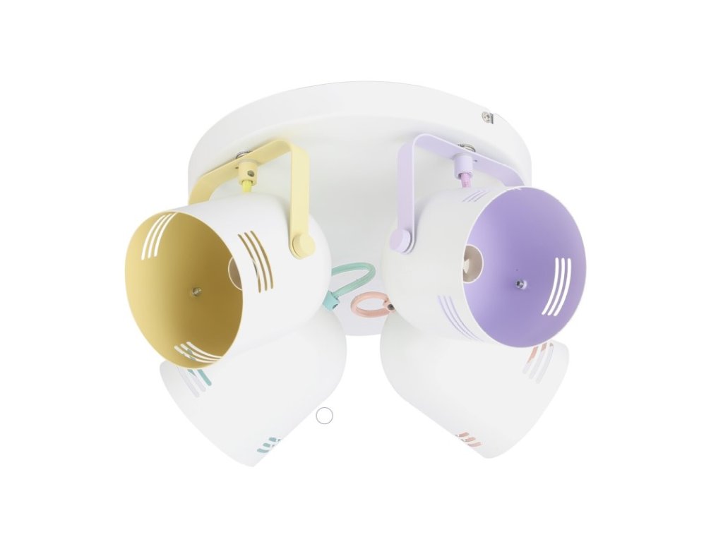 Čtyřnásobné svítidlo Minuet bude díky svým radostným barvám svěžím místem ve vašem moderním bytě. Minuet navrhl Rabalux a primárně ho doporučujeme používat v dětském pokoji. Bílá základní barva zvonovitých, nastavitelných hlavic svítidla je doplněna několika dalšími barvami a velká dekorativní základna je bílá. Díky nastavitelným hlavám svítidla můžete pomocí tohoto stropního světla efektivně osvětlit místnost. Bodové světlo lze použít se čtyřmi žárovkami o výkonu až 40W, patice typu E14. Tento model je dodáván bez žárovek.