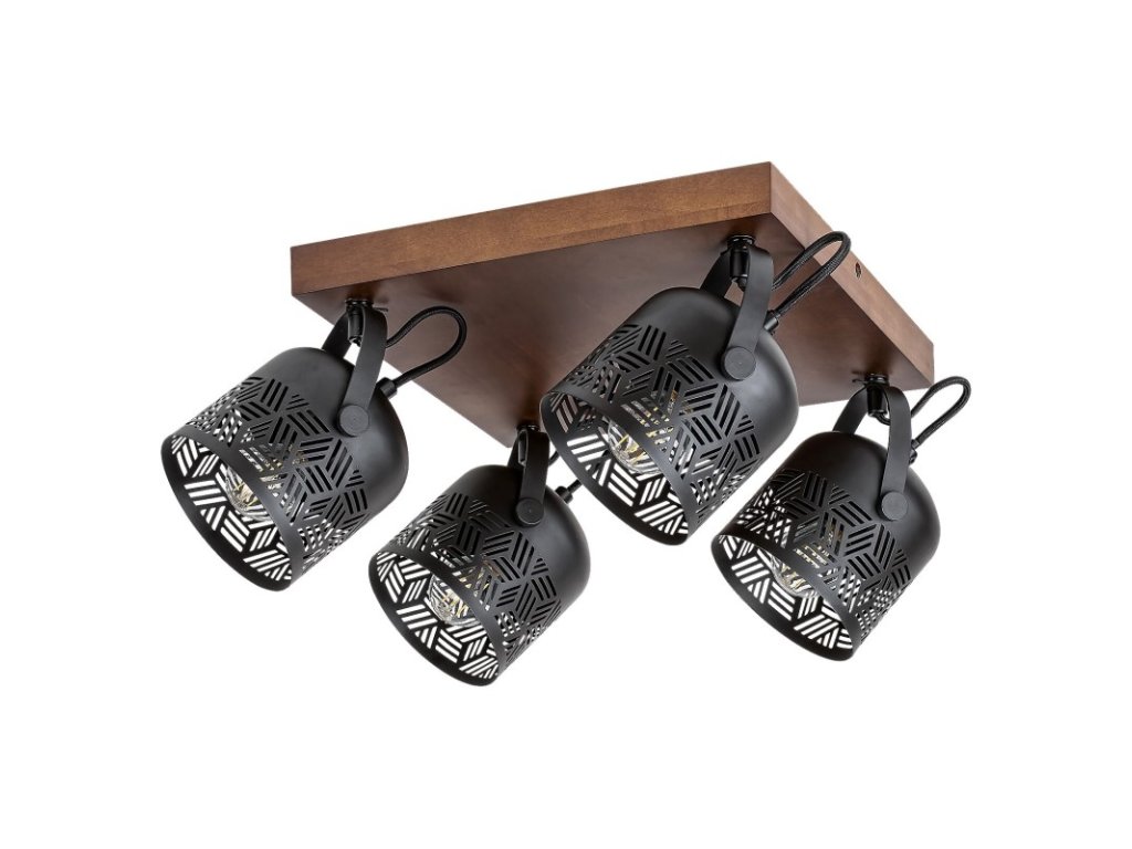 Čtyř žárovkové bodové svítidlo Rotem představující industriální styl bude charakteristickým kouskem vybavení vašeho moderního domova. Rotem vyrobený z kovu a dřeva je doplněn matně černými stínidly ve tvaru zvonu s charakteristickým vzorem a textilními šňůrami. Lze jej připevnit pomocí velké čtvercové dekorativní základny z ořechu. Toto svítidlo lze použít se čtyřmi žárovkami, každá o výkonu až 40W. Typ patice je E14. Tento model je dodáván bez světelných zdrojů.