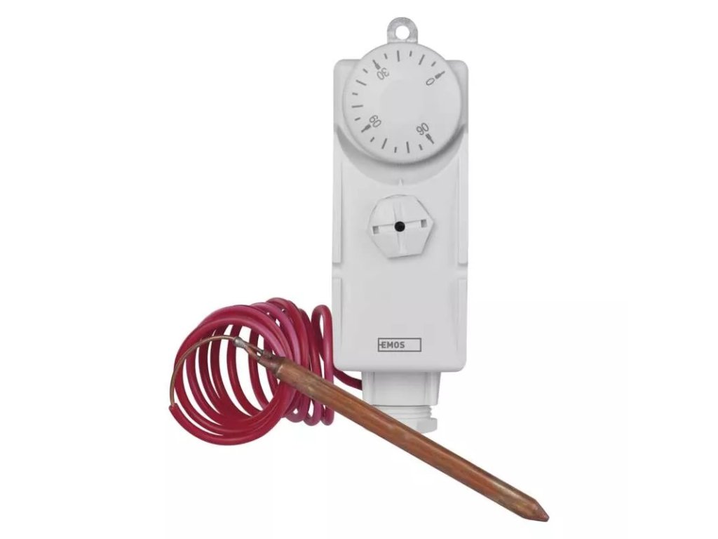 Příložný termostat s prodlouženým čidlem pro povrchovou montáž. Snímá teplotu vody v zásobnících teplé užitkové vody a nebo v topných systémech. Umožňuje regulaci teploty, hlídání teplotních omezení a funkci poklesu teploty.