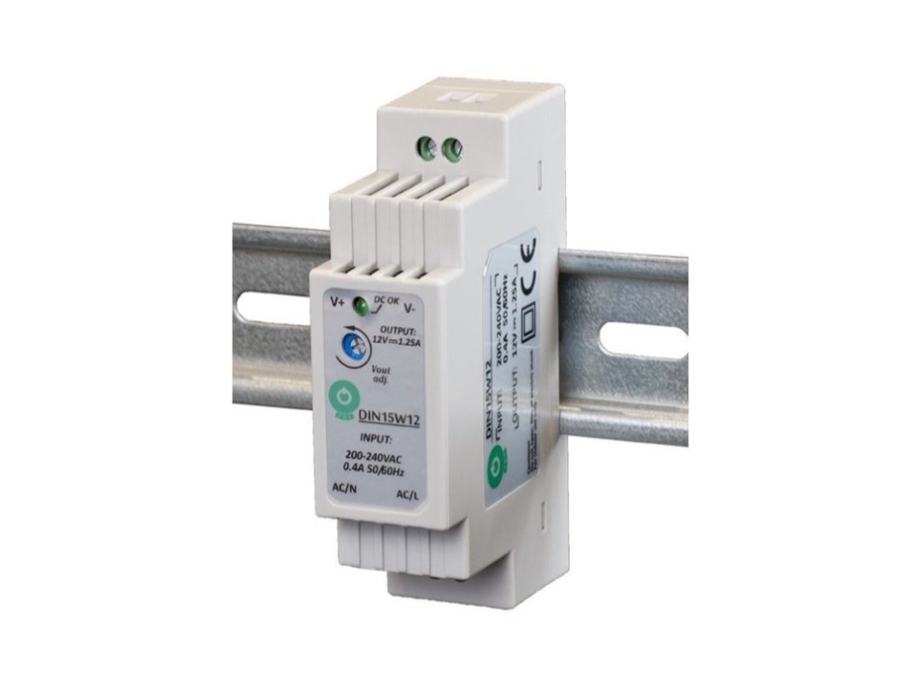 Napájecí zdroj DIN15W12, na DIN lištu 15W, s konstantním napětím 12V DC na výstupu, vhodný pro napájení LED aplikací.