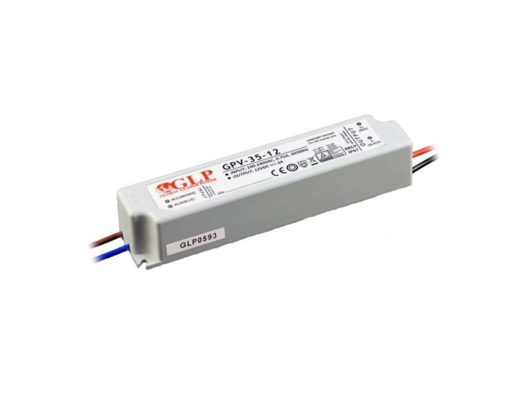 Napájecí zdroj GPV-35-12, 36W, s konstantním napětím 12V DC na výstupu, vhodný pro napájení LED aplikací.