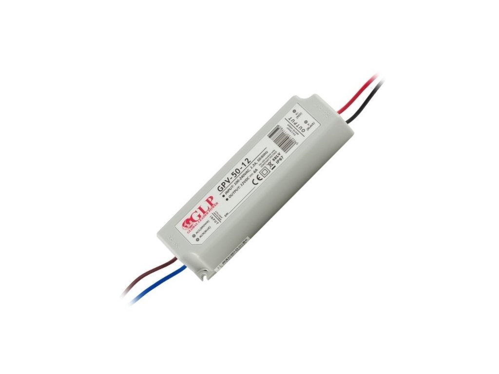 Napájecí zdroj GPV-50-12, 48W, s konstantním napětím 12V DC na výstupu, vhodný pro napájení LED aplikací.